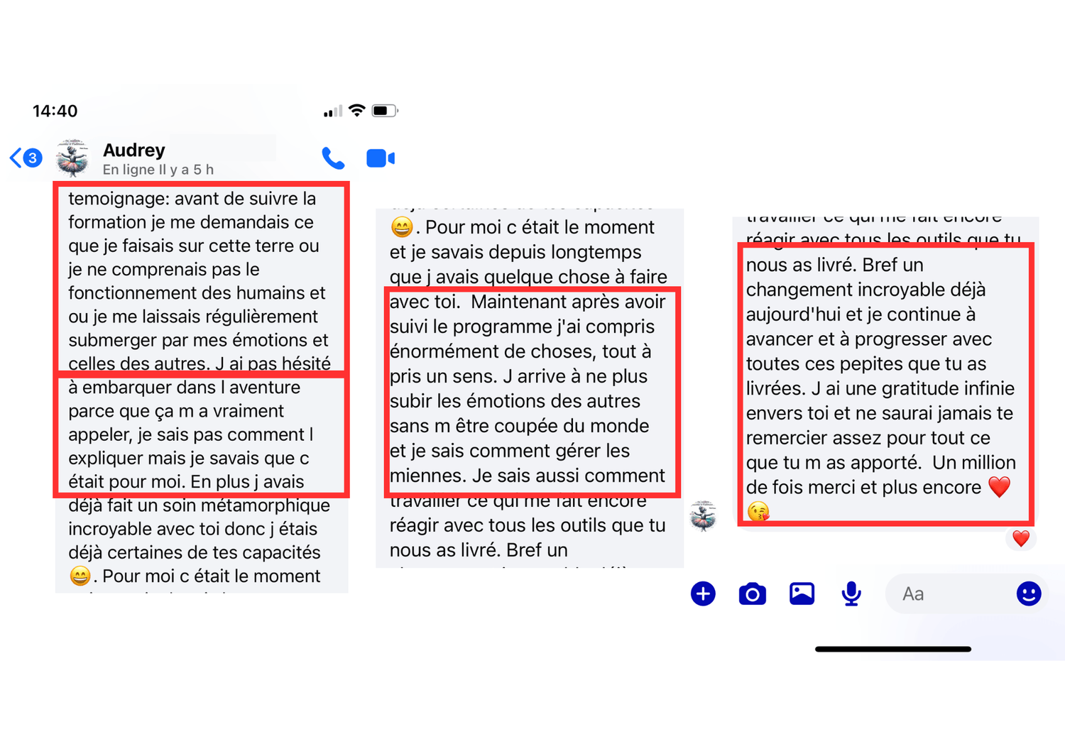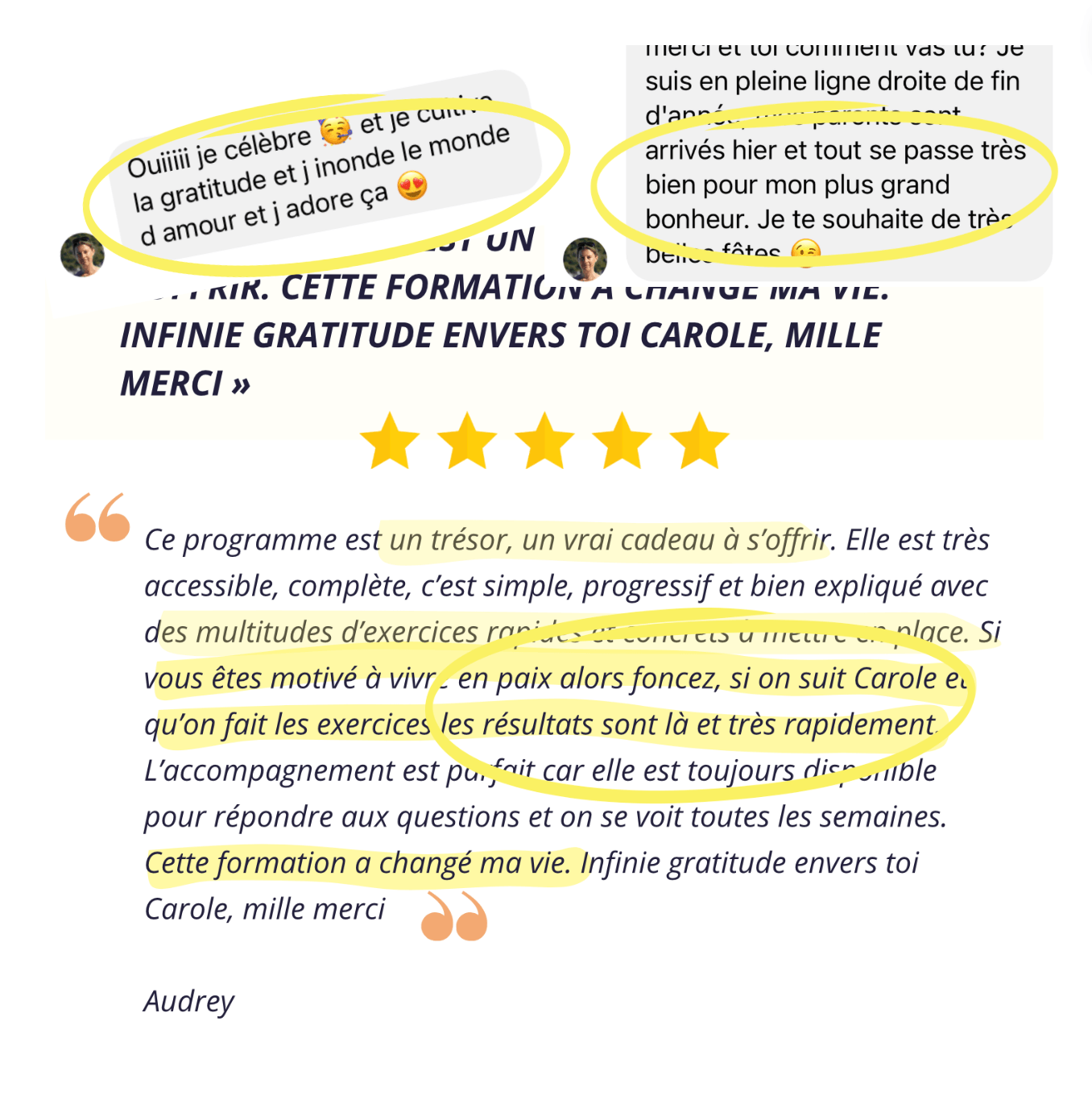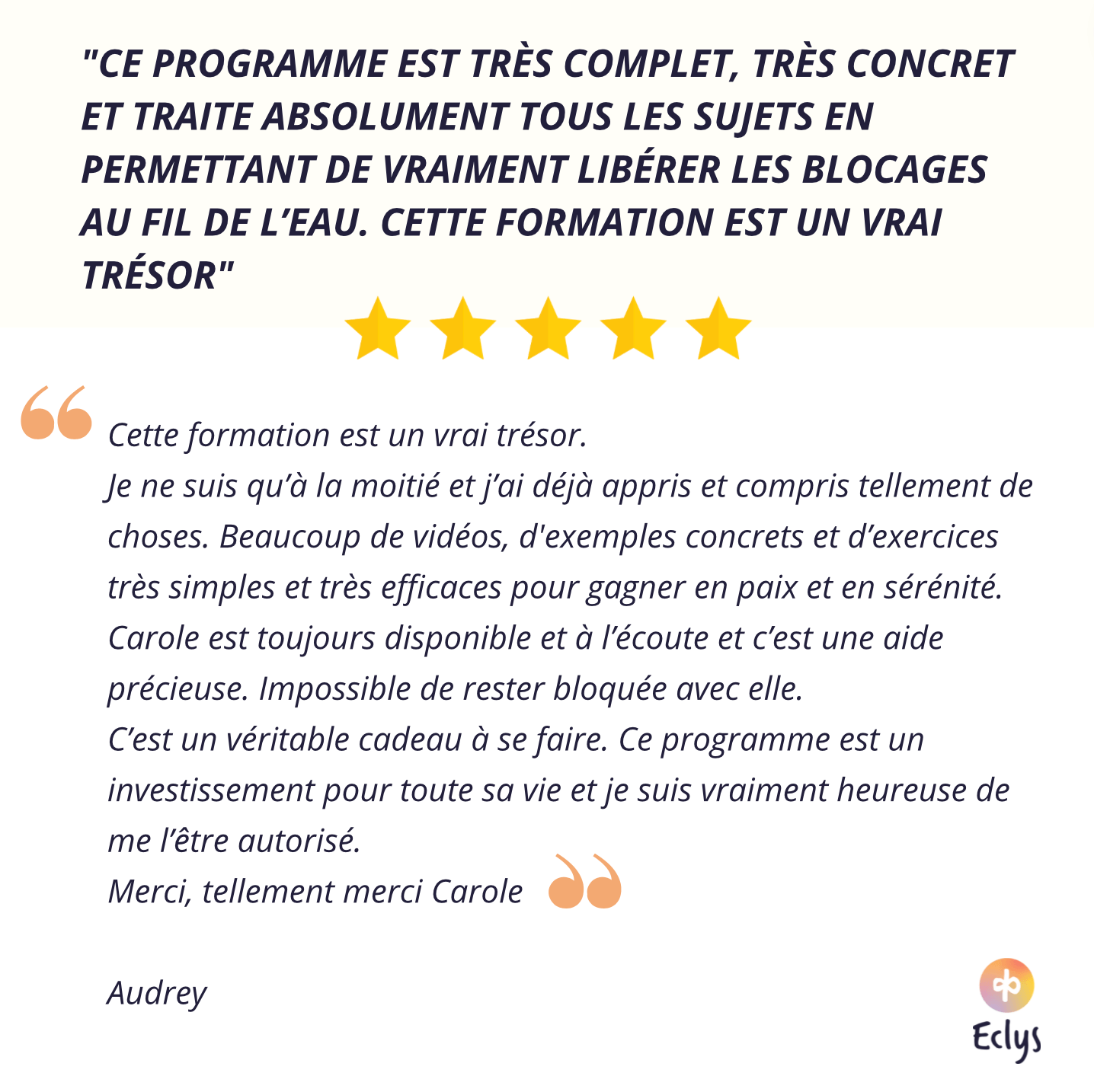 « Nous ne sommes plus obligé de subir. Le mode d'emploi du bonheur existe, il suffit d'apprendre comment faire ! Et si moi j’y suis arrivée… alors toi aussi, tu peux y arriver"